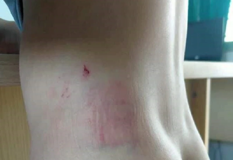 Sau đó, mẹ B. trình báo đến cơ quan chức năng và đưa con đến bệnh viện. B. bị vết thương bầm tím ở lưng, mông, tay, mặt và rách một mảng da đầu.
