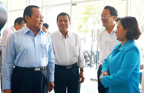 Bí thư Thành ủy TP.HCM Lê Thanh Hải trao đổi với các đại biểu bên lề hội nghị. Ảnh: TÁ LÂM