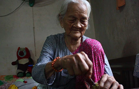 Điều đặc biệt, đôi mắt của cụ Bài vẫn sáng, trong veo. Mang ra hàng chục chiếc gối ôm rực rỡ khâu tay từ nhiều mảnh vải khác nhau cho khách xem, cụ khoe làm để tặng cho con cháu của mình.