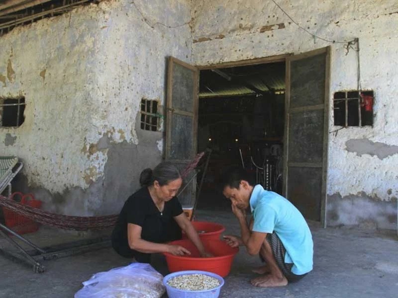 Thấy có khách tới, anh Thảo lê bước chân nặng nhọc ra đón, miệng cười ngơ ngác như gặp được người quen. Từ nhỏ anh bị chậm phát triển trí tuệ, đi đứng nói năng cũng khó khăn. Bà hằng ngày bất kể mưa nắng đều đi bộ vào xóm lột hạt điều mướn. Ngày cao nhất cũng chỉ kiếm được 36.000 đồng. Anh Thảo đang hưởng chế độ người khuyết tật, một tháng được 800.000 đồng. Thỉnh thoảng từ rẻo đất nhỏ trước nhà, anh hái trái bầu, nắm đậu bước thấp cao vào xóm bán, ai trả được bao nhiêu cũng cầm về đưa mẹ.