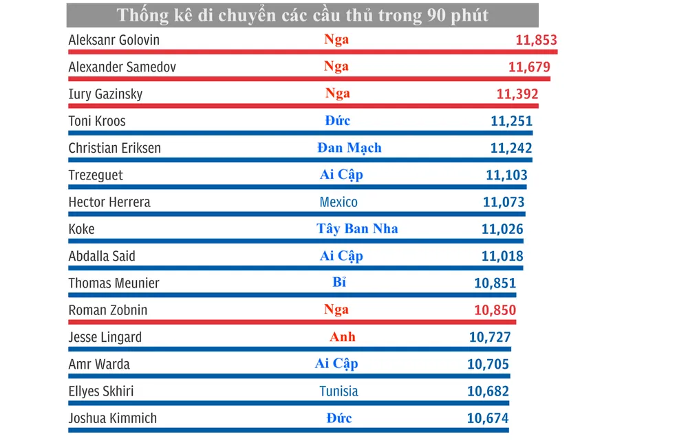 Số liệu thống kê cự ly di chuyển của các cầu thủ Nga cao ngất ngưởng so với các đồng nghiệp khác. ĐỒ HỌA: MQ