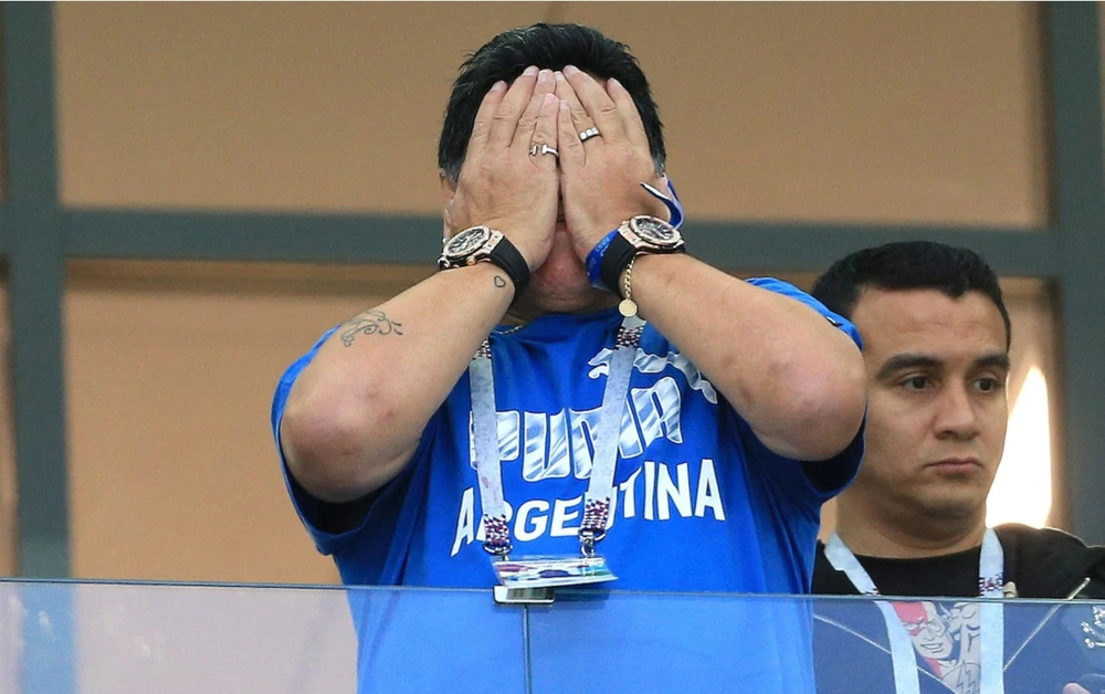 Danh thủ Maradona ôm mặt tiếc nuối về thành tích nghèo nàn của á quân World Cup Argentina.