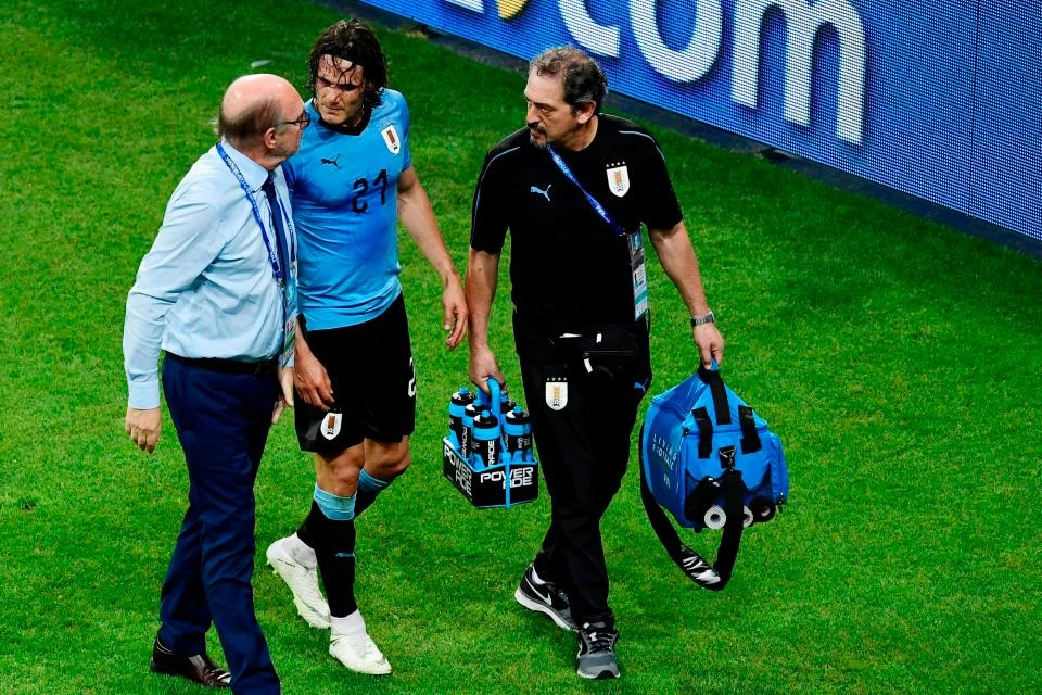 Tiền đạo lập cú đúp giúp Uruguay đánh bại Bồ Đào Nha 2-1 dính chấn thương bắp chân gần cuối trận. Anh khập khiễng và được Ronaldo dìu ra khỏi sân.