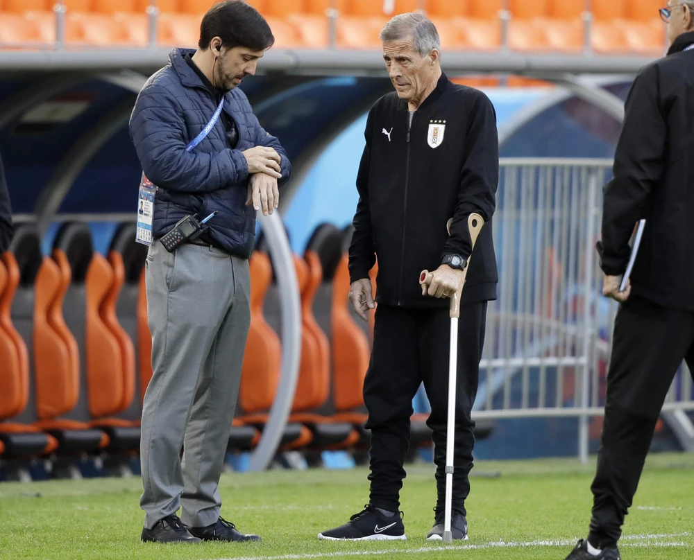 HLV Oscar Tabaez (giữa) luôn sử dụng cây nạng mỗi khi ra sân. Ảnh: AP