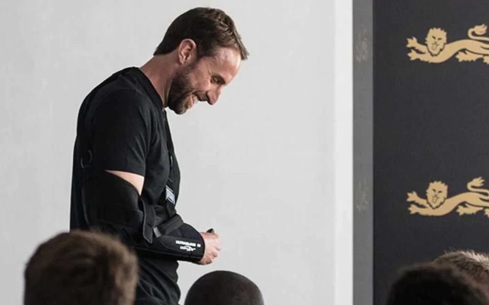 Southgate xuất hiện với chấn thương lạ ở vai khiến các học trò cười nghiêng ngả. ẢNH: TE