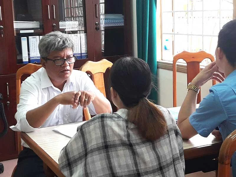 Hòa giải viên Nguyễn Phước Cử (trái) đang hòa giải cho cặp vợ chồng trong vụ ly hôn. Ảnh: T.AN