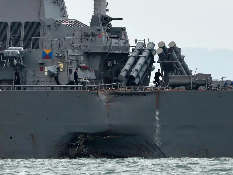 Tàu USS John S. McCain bị “hư hỏng” đáng kể ở phần thân sau vụ va chạm hôm 21-8. Hải quân Mỹ cho hay phần thân tàu bị thủng vào đã khiến cho phòng thủy thủ, phòng máy và phòng thông tin liên lạc bị ngập nước.