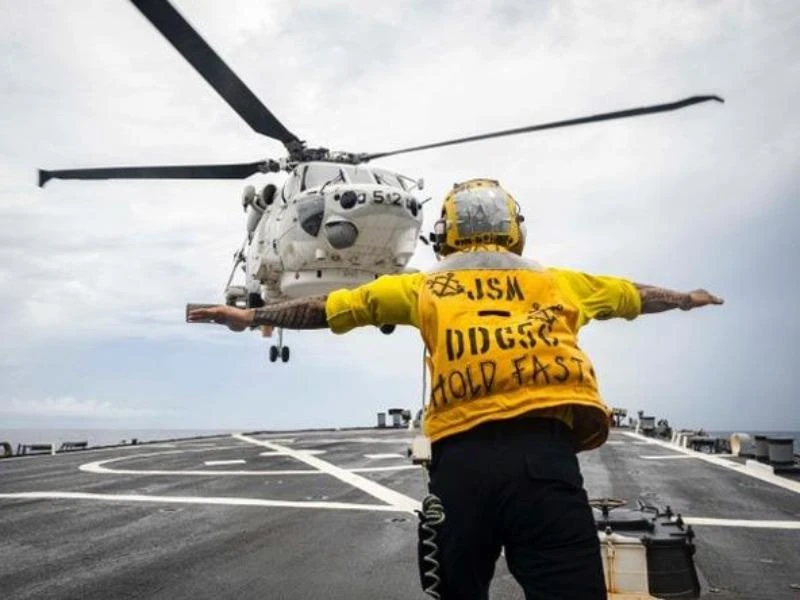 Một máy bay trực thăng SH-60 của Lực lượng Phòng vệ Hàng hải Nhật hạ cánh trên boong tàu USS John S. McCain ở Biển Đông, ngày 12-10. Ảnh: HẢI QUÂN MỸ