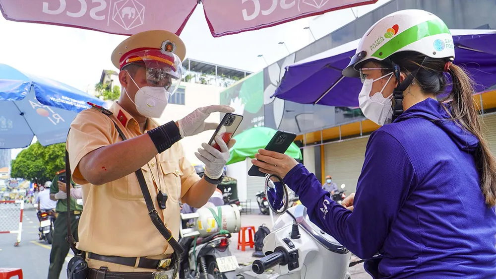CSGT phường 5, quận Phú Nhuận, TP.HCM kiểm tra khai báo y tế của người dân tham gia giao thông trong thời gian siết chặt giãn cách xã hội.