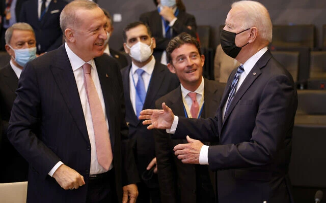 Tổng thống Mỹ Joe Biden (phải) và người đồng cấp Thổ Nhĩ Kỳ Recep Tayyip Erdogan tại hội nghị thượng đỉnh NATO ở Bỉ tháng 6-2021. Ảnh: Olivier Matthys/AP