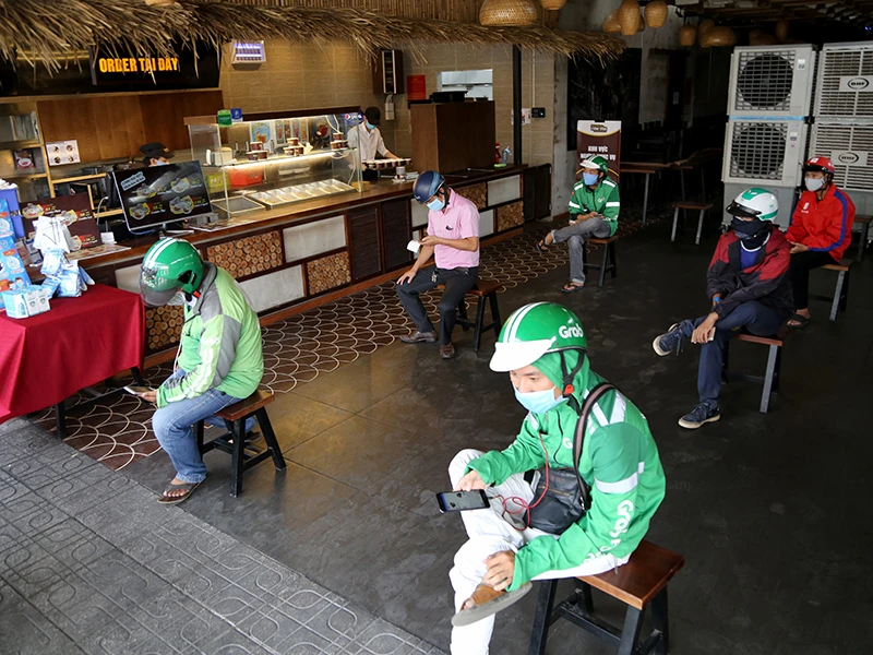 Một quán cơm tấm trên đường Ung Văn Khiêm (quận Bình Thạnh, TP.HCM) xếp sẵn những chiếc ghế cách nhau 2 m cho cả người mua mang về và các shipper ngồi. Ảnh: HOÀNG GIANG