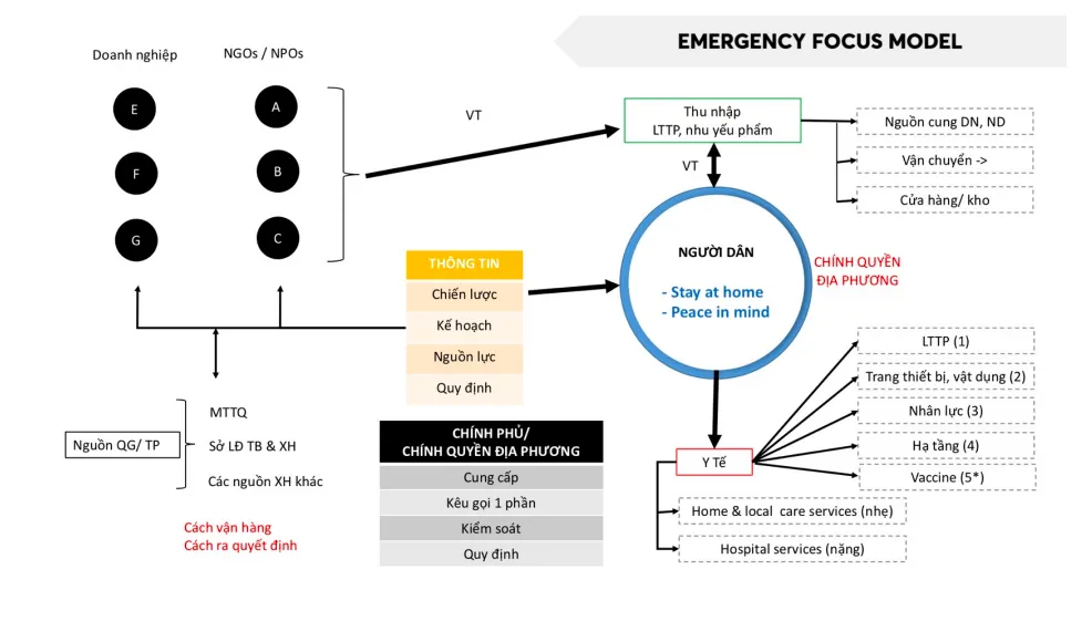 Mô hình đề xuất cứu trợ khẩn cấp ứng phó COVID-19 tại TP.HCM với người dân làm trung tâm. Làm sao người dân yên tâm ở nhà với chăm sóc y tế, lương thực... Ảnh: Quỹ Sống cung cấp