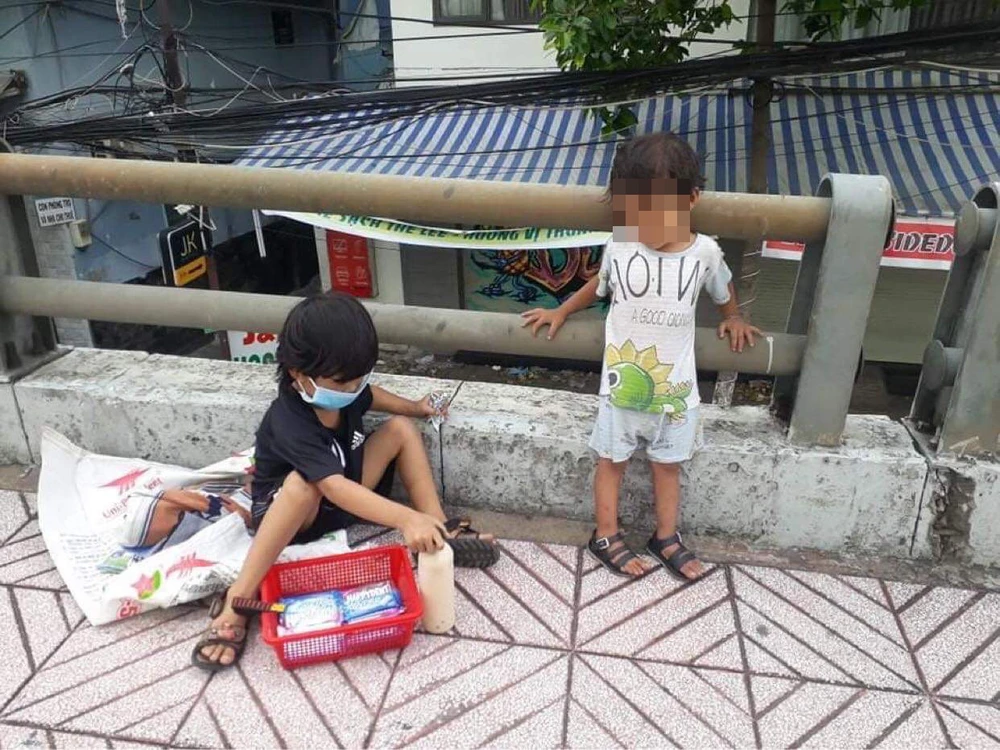 Hai em bé lang thang bán kẹo khi mẹ đã nhiễm COVID-19 đi cách ly. Ảnh: Phạm Trường Sơn cung cấp