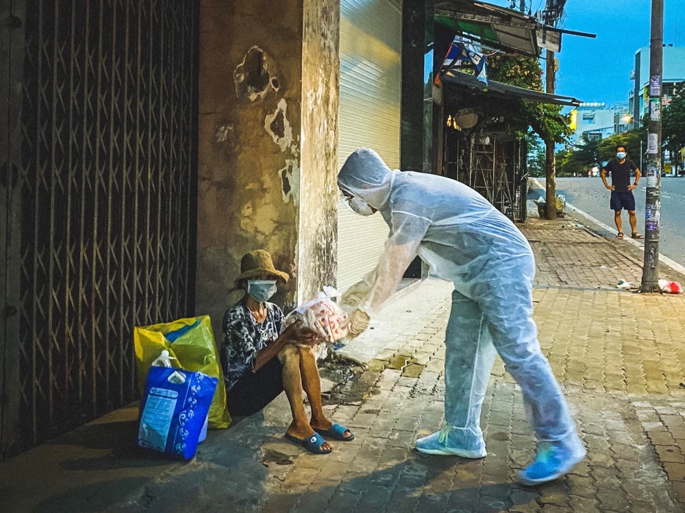 Các nhóm thiện nguyện tại TP.HCM giúp đỡ hàng trăm ngàn người dân TP trong những ngày đại dịch. Ảnh: Một nhóm thiện nguyện giúp đỡ người vô gia cư. Ảnh: PHƯƠNG NGUYỄN