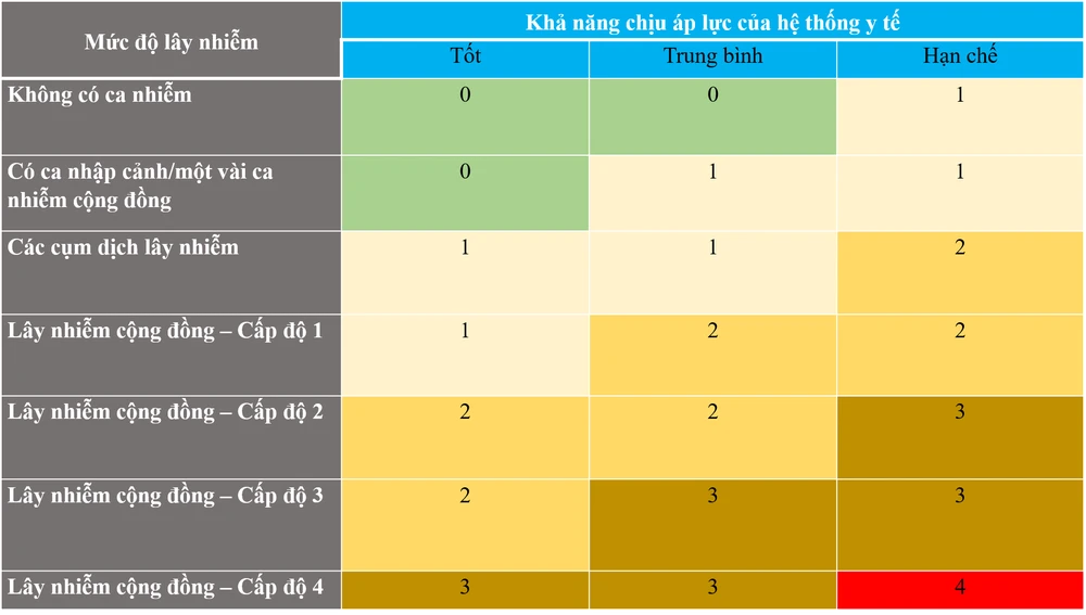 Phân loại cấp độ dịch bệnh dựa vào (1) mức độ lây nhiễm và (2) khả năng chịu áp lực của hệ thống y tế theo mô hình của WHO.