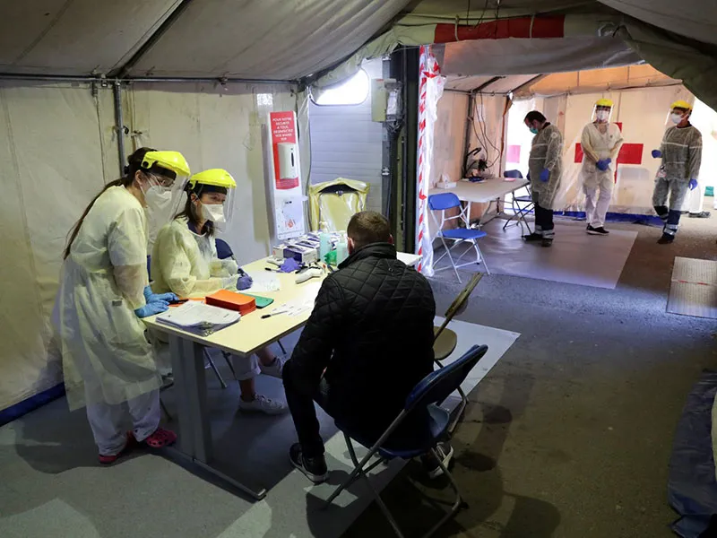 Nhân viên y tế Bỉ tại một điểm xét nghiệm COVID-19 ở BV Erasme, thủ đô Brussels hồi tháng 2. Ảnh: REUTERS