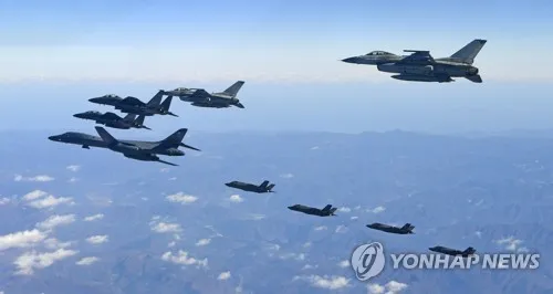 Máy bay ném bom chiến lược B-1B Lancer, máy bay tàng hình F-35B của Mỹ cùng các chiến đấu cơ Hàn Quốc bay qua bán đảo Triều Tiên trong cuộc tập trận hồi 6-12-2017. Ảnh: YONHAP