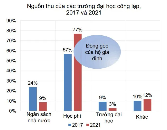 Năm 2017, tỉ lệ này chiếm 57% nguồn thu của trường ĐH trong khi ngân sách nhà nước chỉ 24%. Đến năm 2021, hộ gia đình đóng góp đến 77% còn ngân sách chỉ chiếm 9%.
