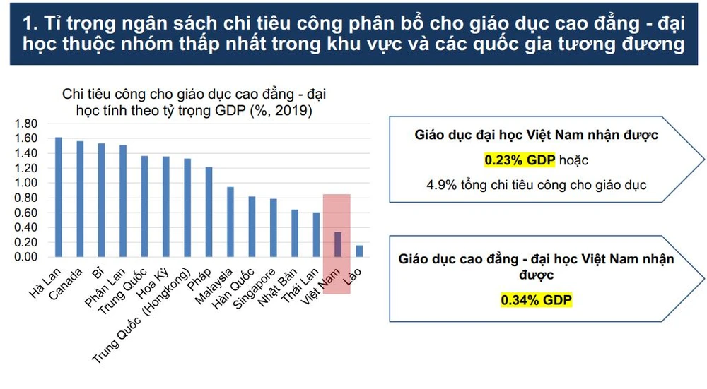 Thứ hai, tăng đáng kể ngân sách nhà nước chi cho giáo dục ĐH, dành 0,8-1% GDP đầu tư cho giáo dục ĐH đến năm 2030, tức hơn 300 triệu USD/năm. Từ nguồn này sẽ giúp các trường có nguồn tài chính bền vững. Sinh viên được tiếp cận bình đẳng bằng các hình thức cho vay dựa trên thu nhập trong tương lai, miễn học phí cho các đối tượng mục tiêu và chương trình học bổng quốc gia.