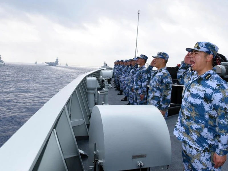Trung Quốc bóp méo lịch sử để bảo vệ yêu sách “tứ sa” phi pháp. Trong ảnh: Một hạm đội hải quân Trung Quốc, trong đó có tàu sân bay Liêu Ninh, tàu ngầm, tàu chiến và máy bay chiến đấu, tham gia tập trận ở Biển Đông năm 2018. Ảnh: GETTY IMAGES