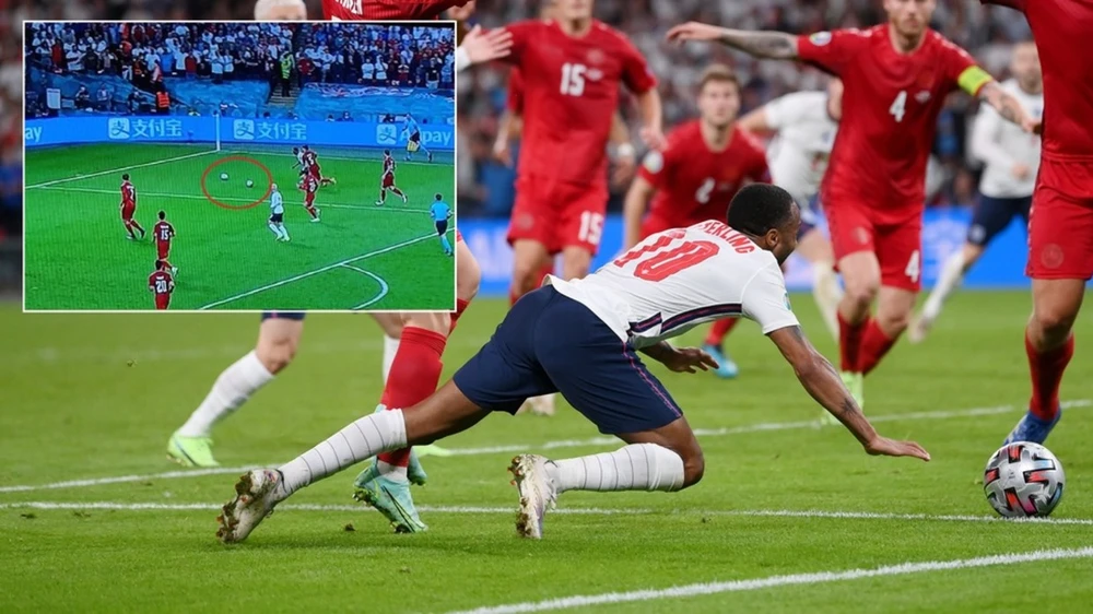 Tuyển Anh bị lọt lưới quả đầu tiên sau năm trận đấu, từ quả sút phạt trực tiếp thành bàn đẹp mắt của Mikkel Damsgaard ở phút 32. Nhưng chỉ gần 6 phút sau đó, chủ sân Wembley nhanh chóng gỡ hòa 1-1 khi đội trưởng Simon Kjaer đá phản lưới nhà trước sức ép của Sterling. Cả hai bước vào hiệp phụ và tình huống gây nổi sóng quanh tiếng còi thổi phạt đền của trọng tài cho chủ nhà diễn ra.