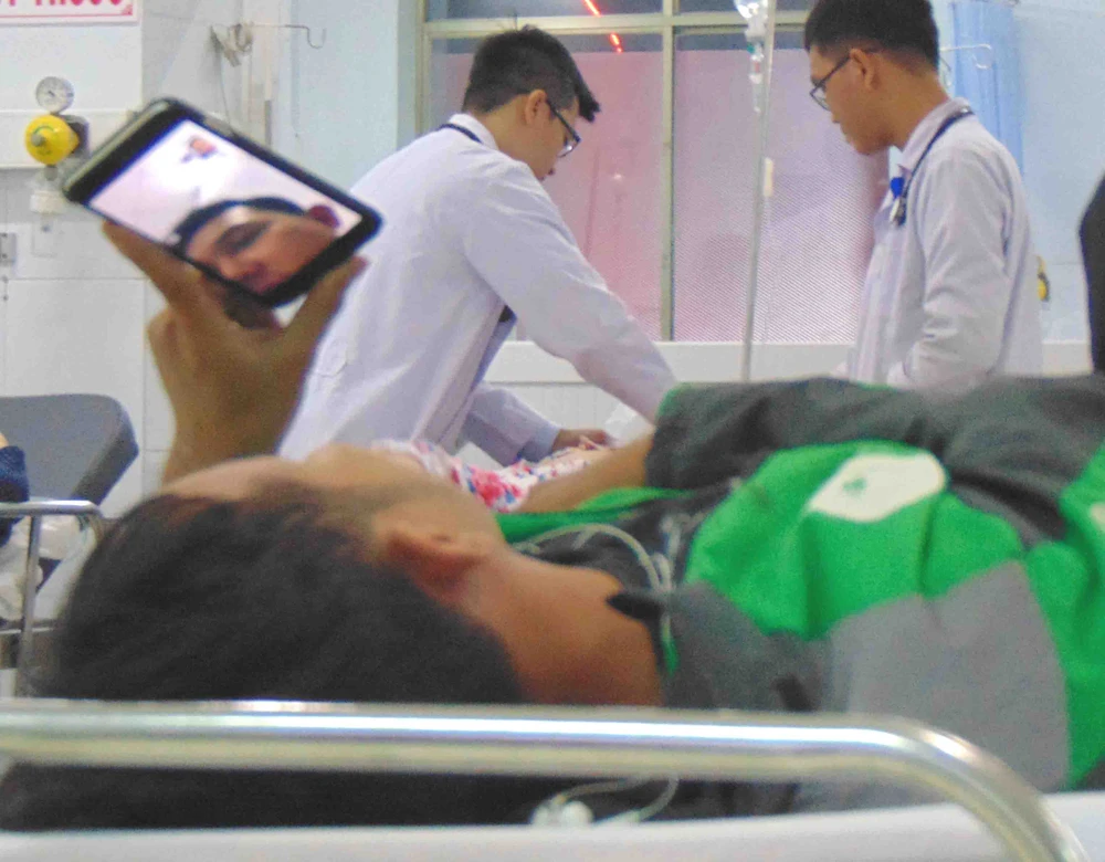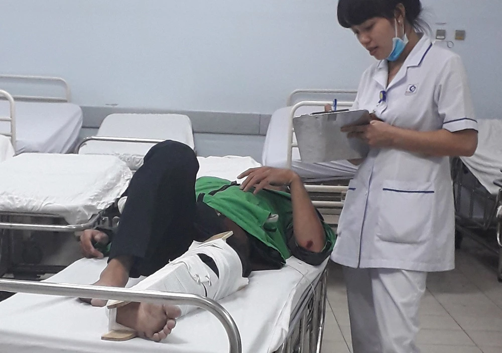 Một ông khoảng 48 tuổi chân trái nẹp chặt được một thanh niên chừng 24 tuổi đẩy vô khoa Cấp cứu.