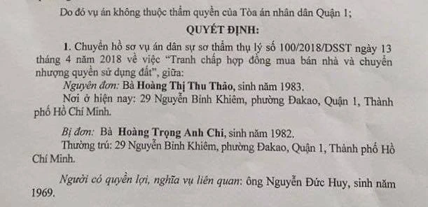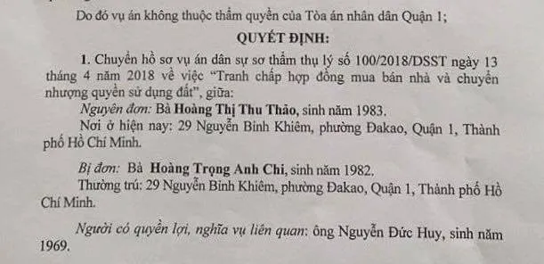 TAND quận 1 cho rằng vụ án không thuộc thẩm quyền của mình