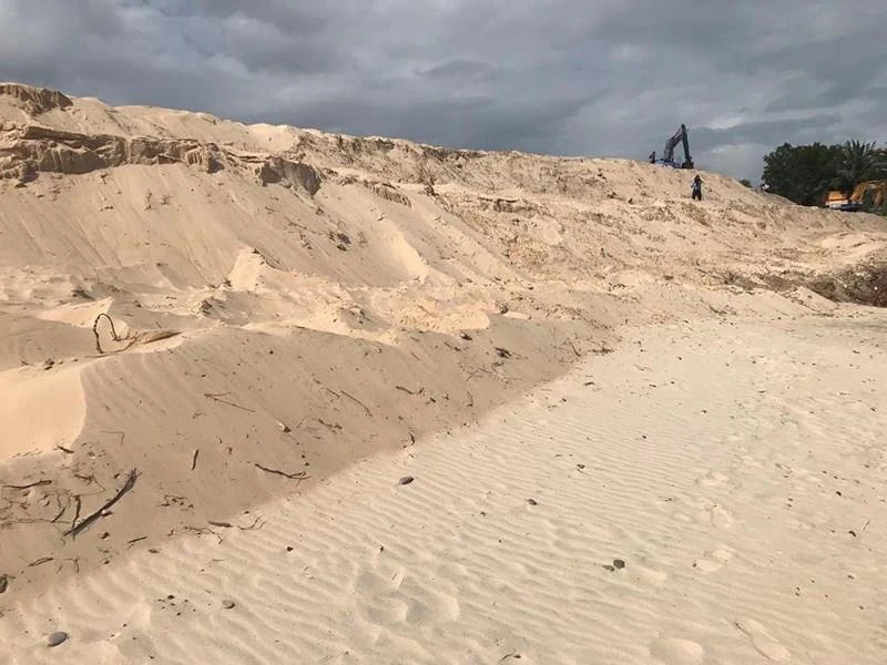 Cụ thể, tại trước bãi đá Bà Khòm (bãi rêu) đã bị cát phủ ra tới mép nước biển, hiện đã không còn nhìn thấy bãi đá con phía trước; tại bãi đá bảy màu cũng bị cát phủ lấp một phần. Việc san ủi trái phép nêu trên đã phá hủy toàn bộ thảm thực vật trên mặt đất và dải phân cách tự nhiên (cây bụi, xương rồng) kéo dài khoảng 100m ngăn cách giữa bãi biển với thửa đất liền kề bị san ủi trái phép. Nguy cơ núi cát cao 10 m tiếp tục phủ lấp lên trên bãi rêu và bãi đá bảy màu là rất cao.