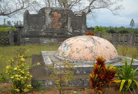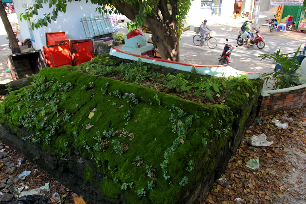Ngôi mộ có mái trũng bám đầy rêu xanh.