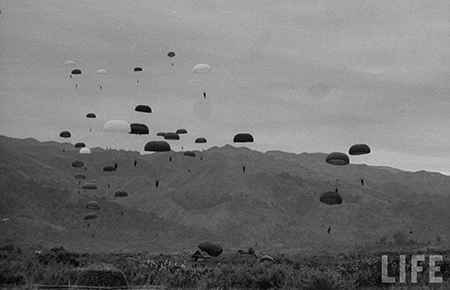 Quân viễn chinh Pháp nhảy dù xuống cứ điểm Điện Biên Phủ. Ảnh tư liệu