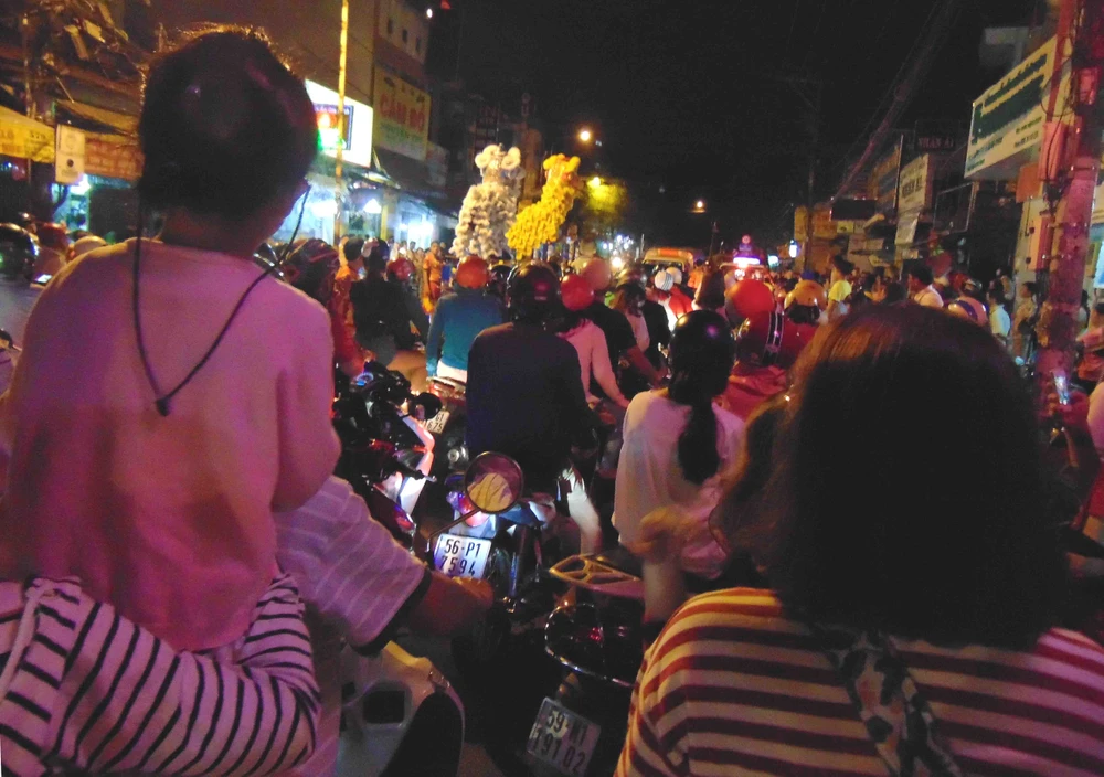 Kẹt xe sáng mùng Một Tết do nhiều người xem múa lân. Ảnh: TRẦN NGỌC