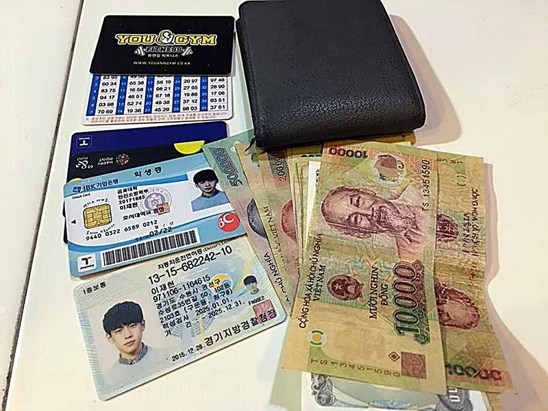 Trong bóp có 1,2 triệu đồng tiền Việt và rất nhiều giấy tờ như bằng lái xe, căn cước, thẻ sinh viên, thẻ tín dụng... đều mang tên Lee Jae Hyun. Theo những thông tin trong giấy tờ thì Lee là sinh viên của Trường ĐH Hoseo, Hàn Quốc.