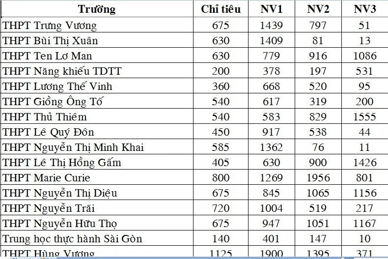 Ở NV2, đăng ký cao thuộc về các trường như THPT Phạm Văn Sáng là 1.985 đăng ký (chỉ tiêu nhận 765), THPT Marie Curie là 1.956 đăng ký (chỉ tiểu là 800), THPT Nguyễn Tất Thành có 1.889 đăng ký (chỉ tiêu là 810), THPT Trần Văn Giàu nhận 1.749 đăng ký (chỉ tiêu là 900)… Hầu hết những trường này có số đăng ký ở NV1 cũng ở mức cao hơn so với chỉ tiêu.