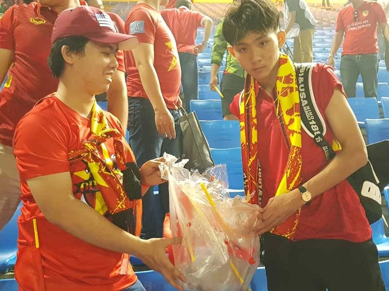 Ông Thái Bá Y (ngoài cùng bên phải, trên) và con trai ông (phải, dưới) nhặt rác trên khán đài sân Olympic sau trận đấu. Ảnh: CTV