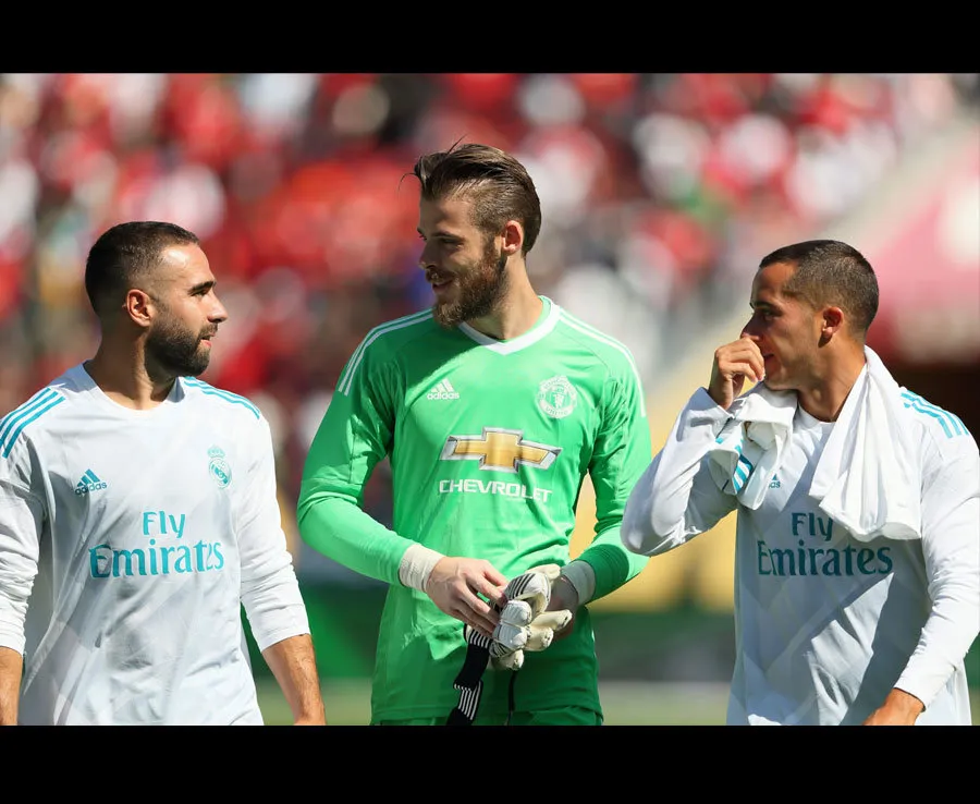 De Gea trao đổi với các cầu thủ Real trong trận giao hữu mới đây giữa Real và MU.