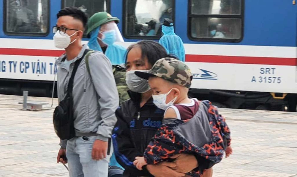 Em NTNA (11 tuổi, thôn Thuận Giang, xã Thuận Lộc, thị xã Hồng Lĩnh, Hà Tĩnh) cùng người dân vui mừng khi được đi tàu miễn phí về quê. 25 ngày qua, mẹ của em A. (làm công nhân) phải đi cách ly tập trung, em A. sống một mình trong phòng trọ hơn 8m2. Hàng ngày, em được mọi người cho gì ăn nấy, rồi em được xét nghiệm âm tính và lên tàu về quê trong đợt 1.