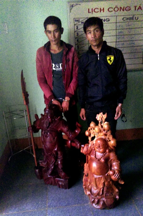 Nghi vấn đó là kẻ trộm, tổ công tác liền truy đuổi. Hai đối tượng thấy thế liền nhấn ga bỏ trốn sang xã Ia Nhin. Tại đây, tổ công tác đã phối hợp với Công an xã Ia Nhin bắt được hai đối tượng trên tại thôn Kênh Chóp và thu được tang vật là một tượng phật di lặc bằng gỗ cà-te.