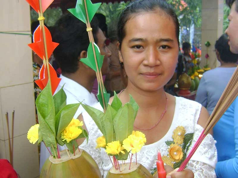 Các thứ hoa, trái tượng trưng cho sự thanh khiết và thiêng liêng ấy tập trung trên một vật cúng hết sức đặc biệt mà đồng bào Khmer gọi là Slathođôn - bình bông làm bằng trái dừa. Phần cây bông được tạo thành bởi những lá trầu xanh và những bông hoa. Miếng trầu, lễ vật không thể thiếu trong các nghi thức đám cưới, cúng giỗ tổ tiên của các dân tộc ở ĐBSCL được cụm thành chiếc lá để trang trí cho Slathođôn.