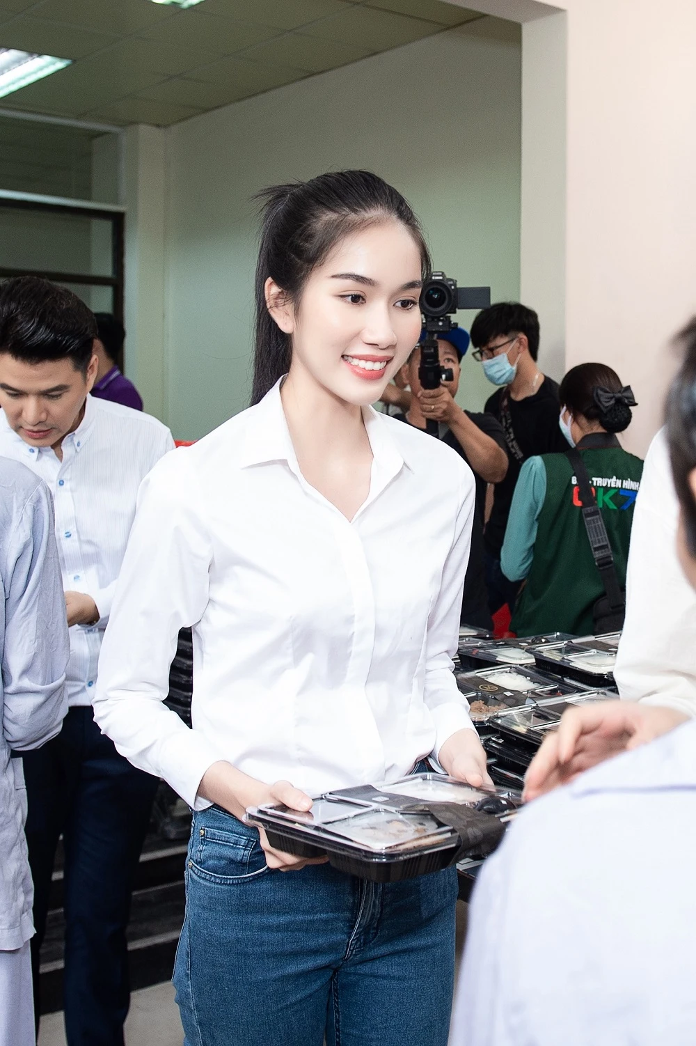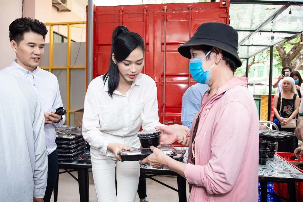 Xuất hiện trong trang phục giản dị, bốn cô gái đã phát các suất cơm từ thiện cho các bệnh nhân có mặt tại đây.