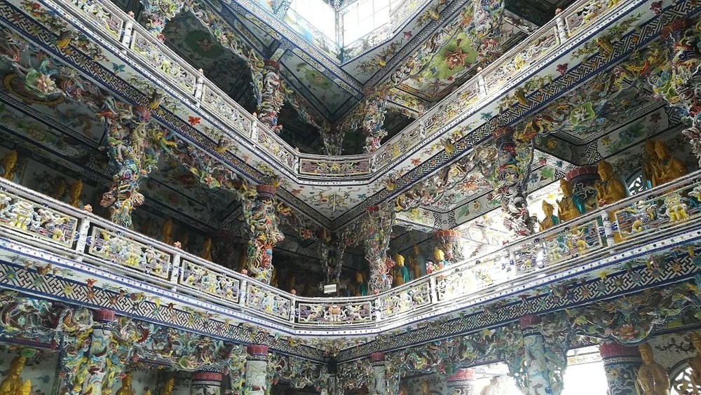 Xung quanh chùa được khảm bằng những hình ảnh hết sức đa dạng, đáng nói là chúng đều được khảm từ những miếng ve chai, đòi hỏi rất nhiều công sức.