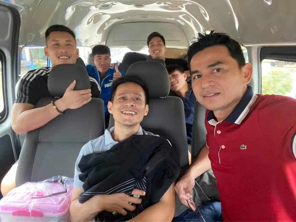 Kiatisak, trợ lý Bundit cùng các cầu thủ HA Gia Lai trên chuyến xe ra Hà Nội. Ảnh: CCT.