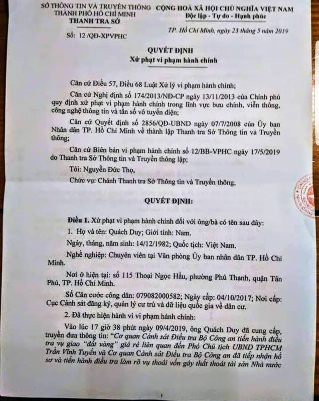 Ông Nguyễn Đức Thọ - Chánh Thanh tra Sở Thông tin và Truyền thông TP.HCM, vừa ký quyết định xử phạt vi phạm hành chính đối với ông Quách Duy (37 tuổi), chuyên viên Văn phòng UBND TP.HCM.