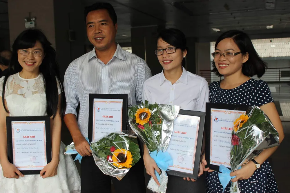 Phóng viên Hoàng Lan (thứ 3 từ trái sang) trong một lần nhận giải báo chí TP.HCM. Ảnh: HL