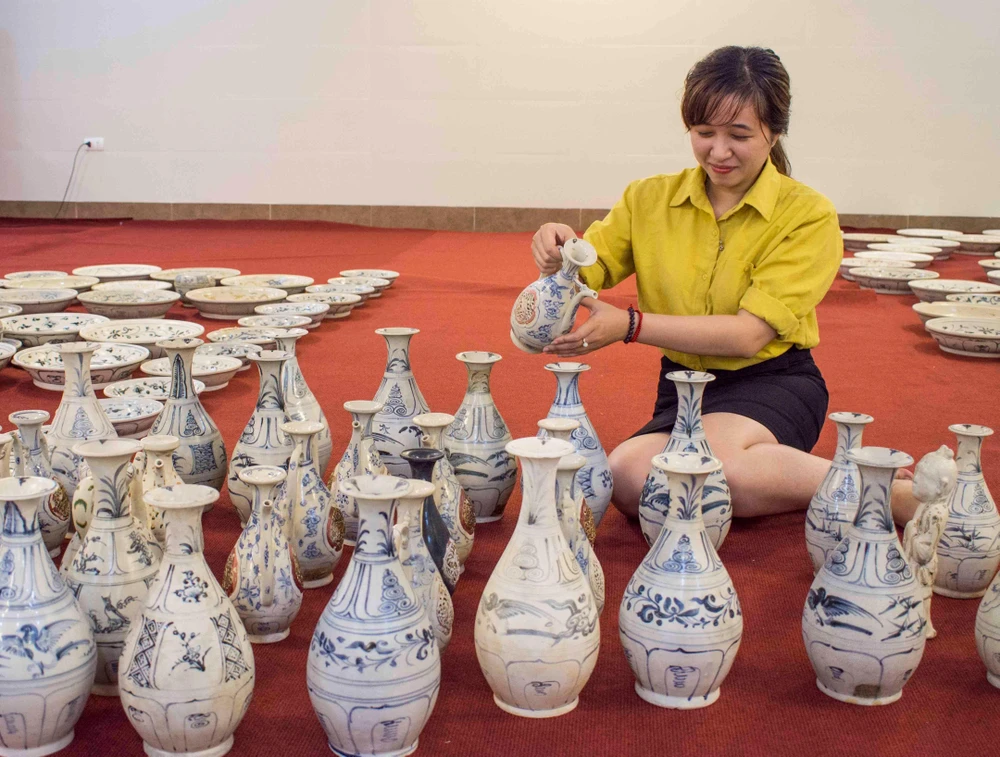 Trải khắp nền nhà trưng bày là rất nhiều loại bát, đĩa, bình gốm sứ... Bình kendy gốm sứ Chu Đậu được người xưa thiết kế kiểu bình của Nhật Bản, giới cổ vật đánh giá nếu chiếc bình này còn nước men sáng, không bị sứt mẻ thì được tính theo giá ngàn đô la.