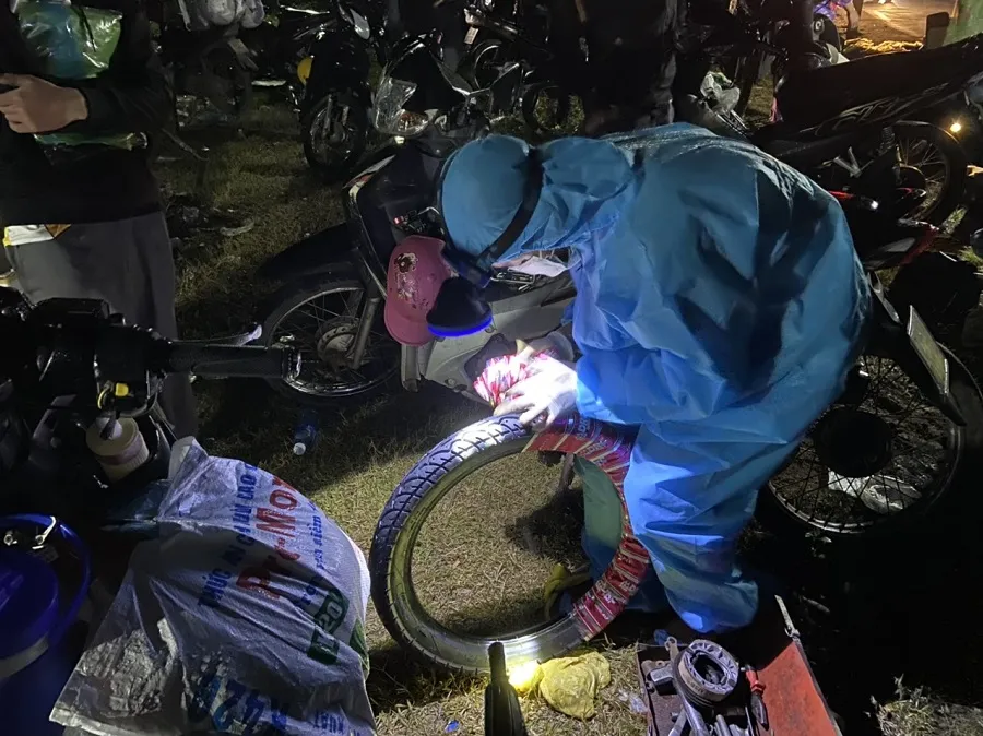 Từ nhiều ngày qua, khoảng 30 thành viên nhóm Tình nguyện trẻ Đà Nẵng không ngại đêm hôm, mưa gió túc trực để tiếp tế đồ ăn, nhu yếu phẩm, áo mưa, nước uống… cho người dân về quê. Những chiếc xe máy cà tàng, hư hỏng sau khi chạy hàng ngàn km được các thành viên sửa chữa, hỗ trợ vận chuyển từ đèo Lò Xo (Quảng Nam) đến trạm kiểm soát Lăng Cô (Huế).
