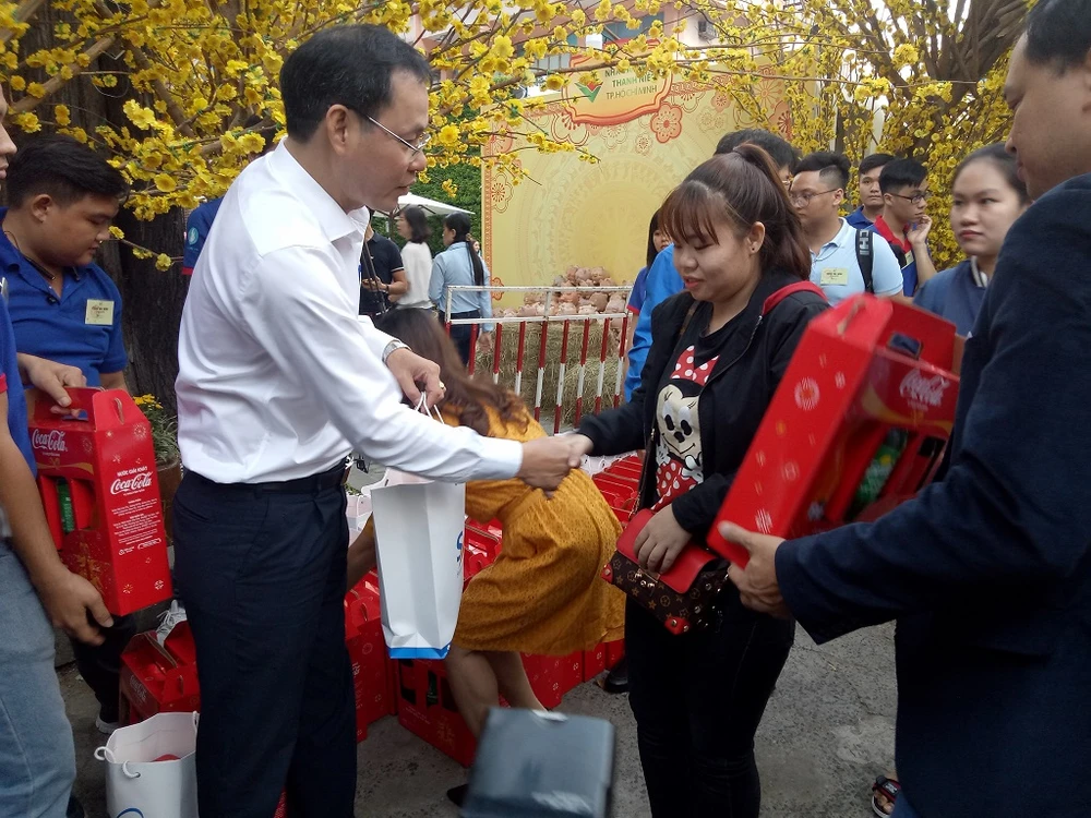 Trước khi lên xe, các sinh viên còn được nhận các phần quà Tết. Ảnh: TRÚC PHƯƠNG