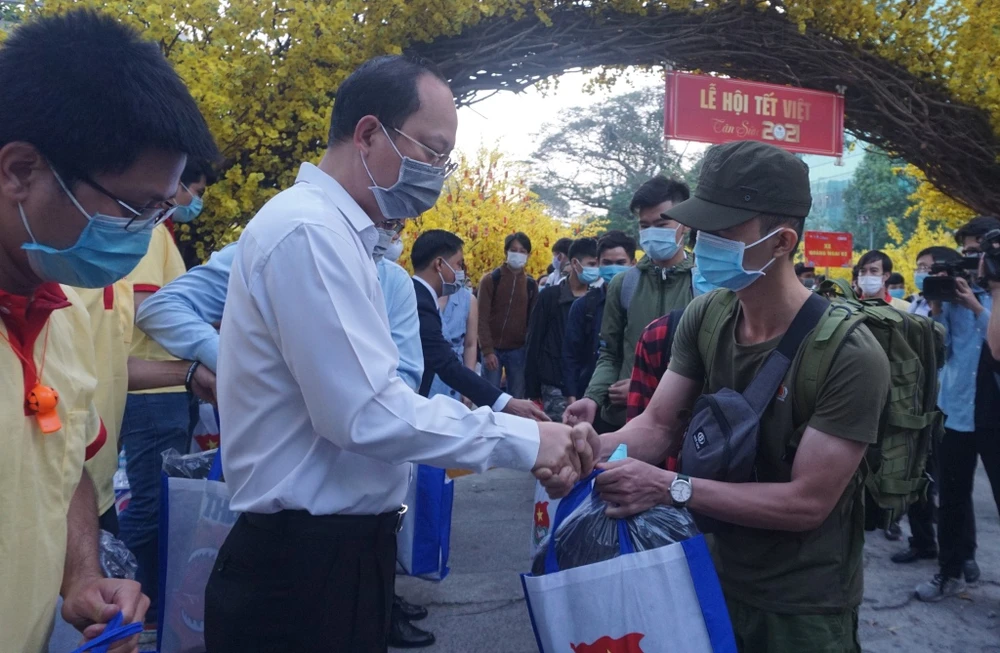 Trước khi lên xe, các bạn sinh viên còn được nhận quà từ lãnh đạo TP. Trong ảnh, ông Nguyễn Hồ Hải, Phó Bí thư Thành ủy TP.HCM trao quà và chúc tết cho các sinh viên.