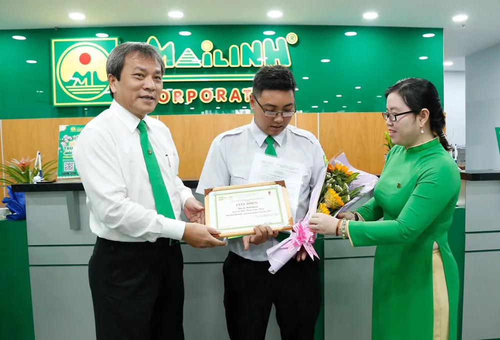 Lãnh đạo Công ty Mai Linh biểu dương trao tặng giấy khen với người tài xế tốt bụng.