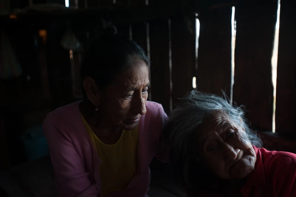 "Bà Maria Mateo (phải) là người già nhất làng, có lẽ đã trên 100 tuổi. Bà đã bị điếc, và cũng không còn có thể nói được. Đôi mắt mà cũng không còn nhìn thấy được nữa. Bên trái là cô Hortencia Mateo, cháu gái của bà, người đang chăm sóc bà. Hai bà cháu sống chung với nhau trên một ngọn đồi nhìn xuống ngôi làng”.
