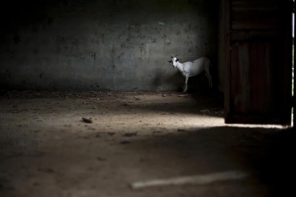 “Đây là một trong những cơ ngơi duy nhất trong làng được xây bằng bê-tông. Trước kia đây là một trường học nhưng chỉ hoạt động được 3 năm, và đã đóng cửa cách nay 18 năm, khi những gia đình cuối cùng bỏ làng lên thành phố sinh sống. Hiện nay, ngôi trường này biến thành nơi súc vật ở, như con dê trong bức hình này”.